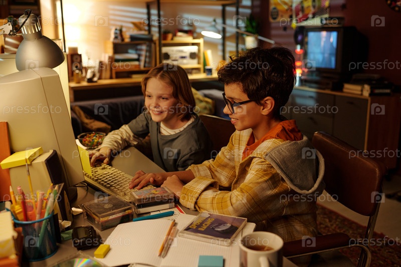 Дети учатся на компьютере в уютной комнате