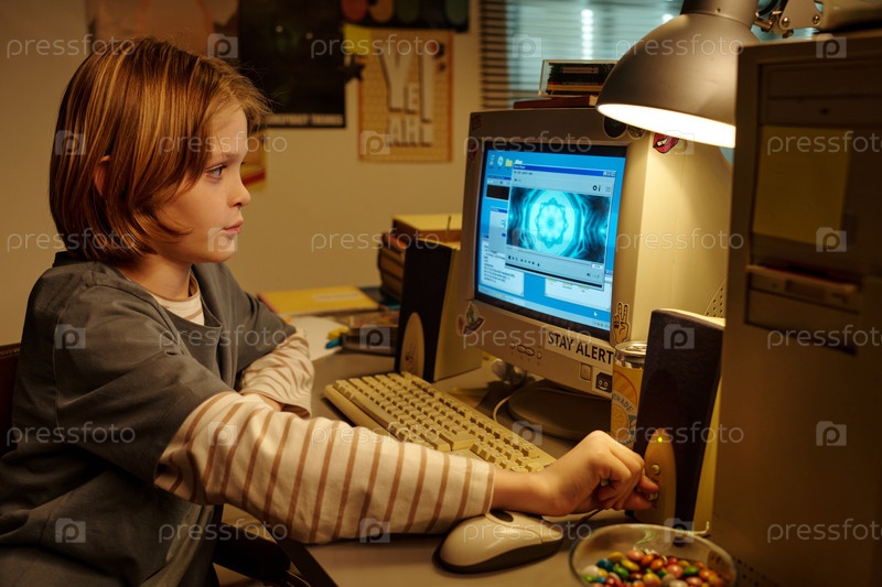 Молодой ребенок исследует компьютер на рабочем столе в помещении