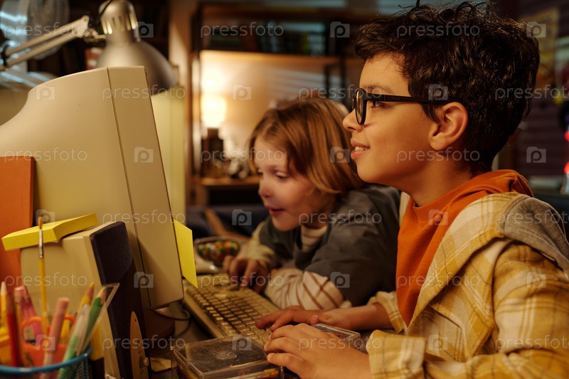 Дети, использующие компьютер в уютной домашней среде
