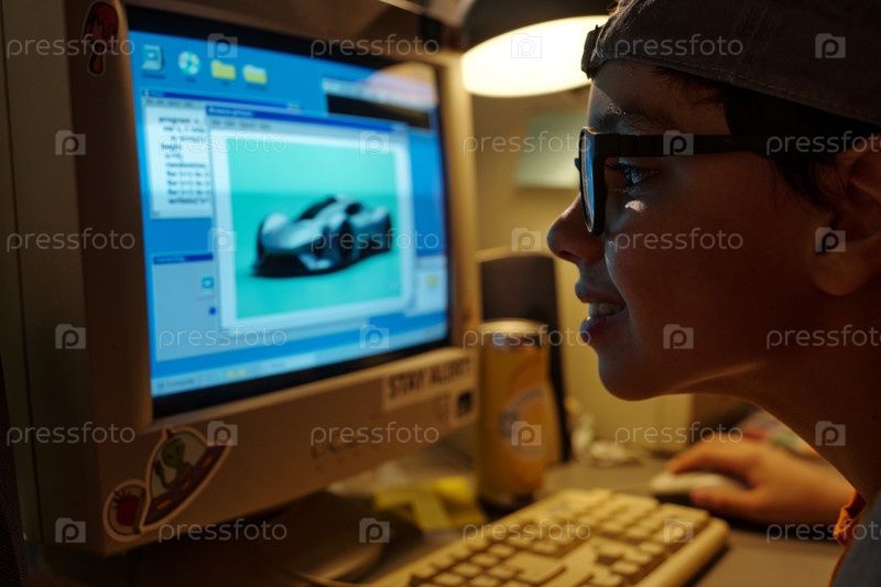 Улыбающийся мальчик занимается дизайнерским программным обеспечением на компьютере
