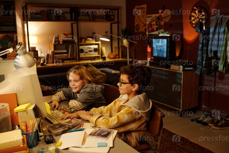 Дети наслаждаются ретро-игрой в уютной комнате