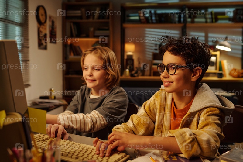 Улыбающиеся мальчики наслаждаются компьютерной игрой в уютной комнате