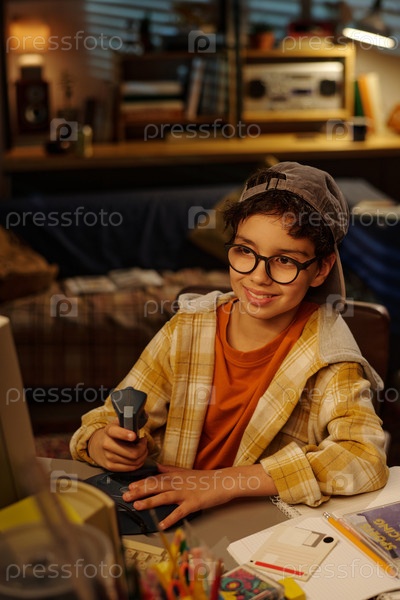 Портрет улыбающегося мальчика, держащего фонарик за столом