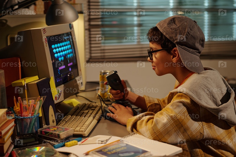 Молодой человек играет в видеоигры на компьютере за рабочим столом