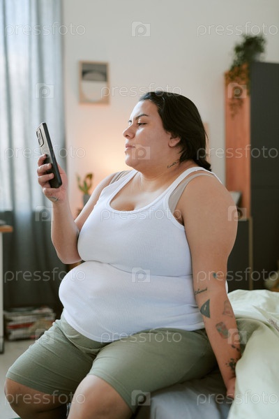 Использование смартфона, сидя на кровати дома