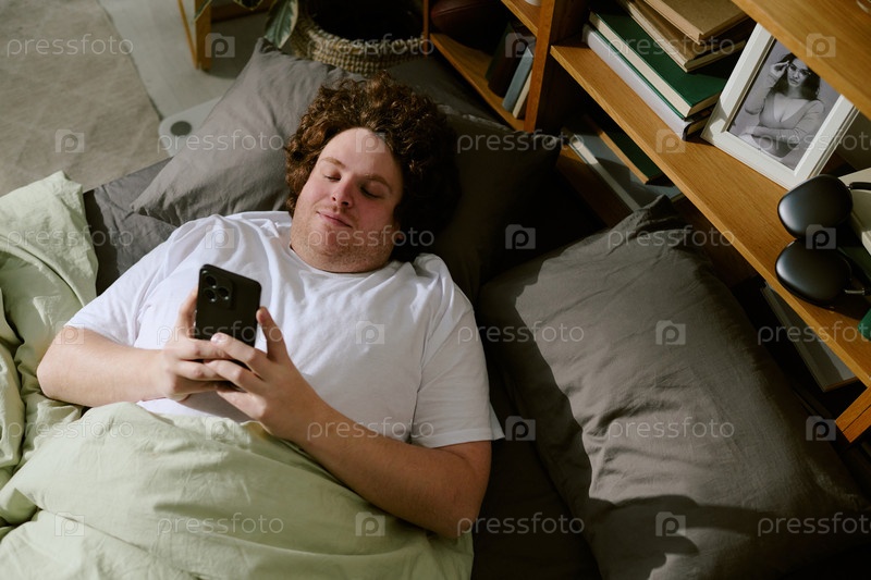 Смотреть на смартфон, лежа на кровати в спальне