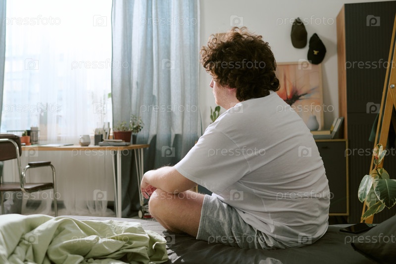Человек сидит на кровати и смотрит в окно солнечной комнаты