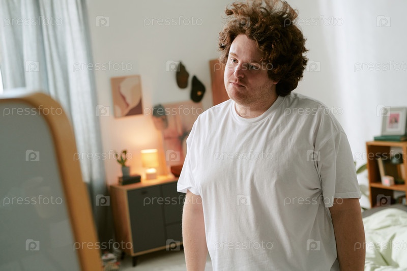 Портрет кудрявого мужчины, стоящего в уютной спальне