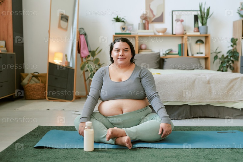 Портрет беременной женщины, медитирующей в уютной домашней обстановке