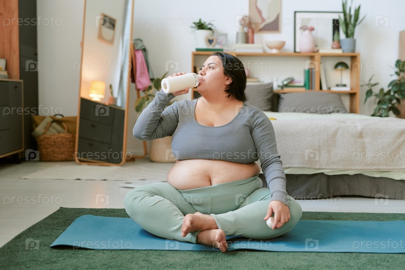 Беременная женщина пьет молоко в спальне