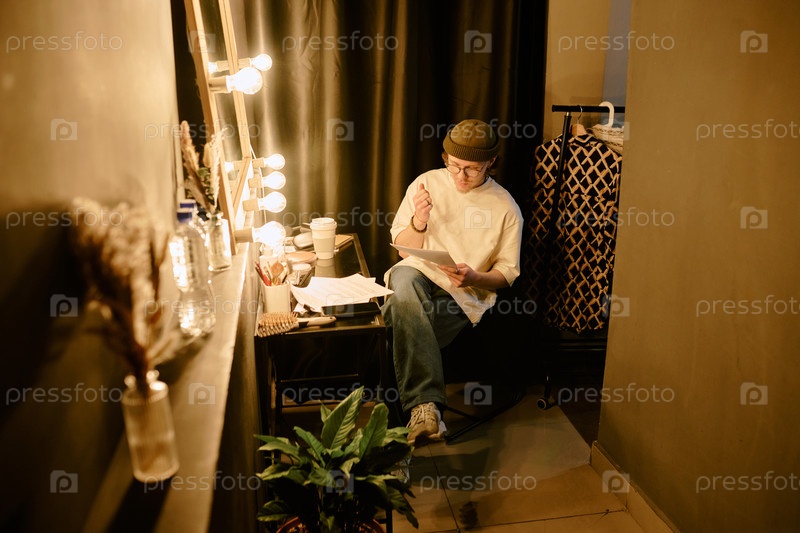Концентрирующийся человек читает документ под теплым освещением