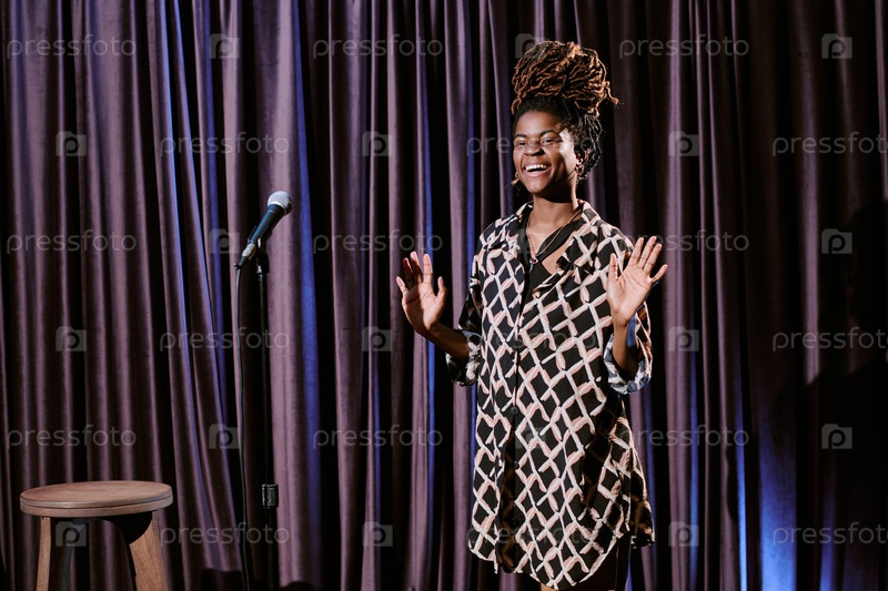 Улыбающийся исполнитель, стоящий на сцене во время шоу