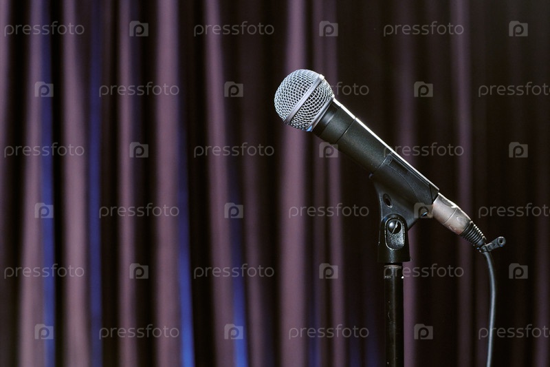 Микрофон на стенде с темным фоном занавески