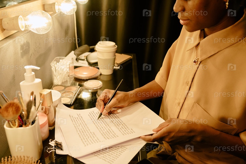Изучение документов за столом с гримом и кофе
