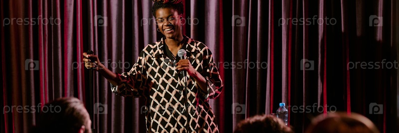 Улыбающийся комик выступает на сцене с микрофоном