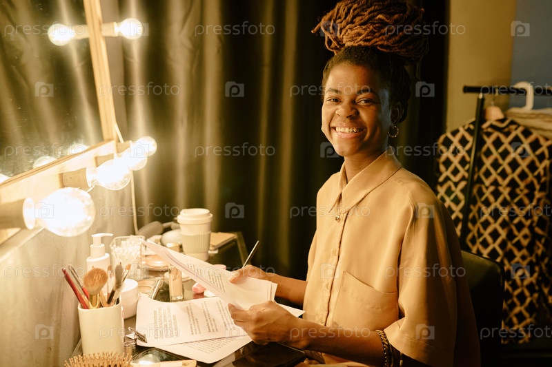 Улыбающаяся афроамериканская женщина читает документы за кулисами