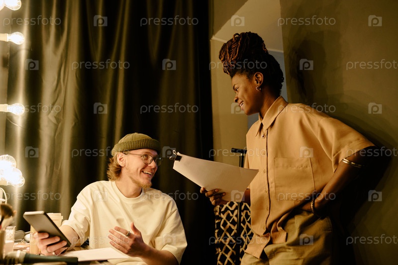 Улыбающиеся коллеги обсуждают проект в офисной среде