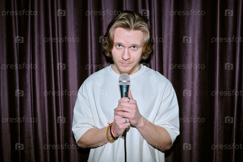 Портрет мужчины, держащего микрофон против занавески