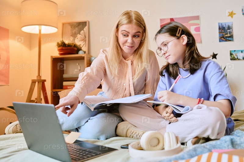 Мать помогает дочери с домашними заданиями в постели