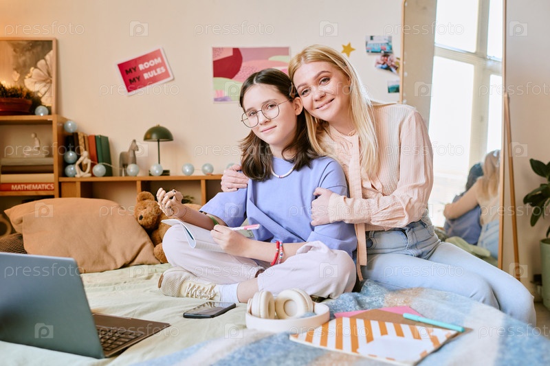 Мать обнимает дочь, сидя на кровати в спальне