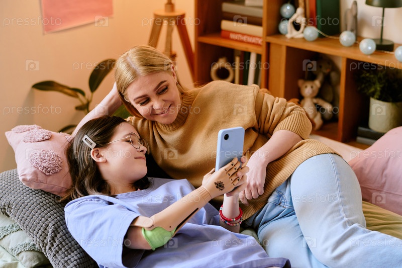 Молодые женщины фотографируются, отдыхая на диване дома