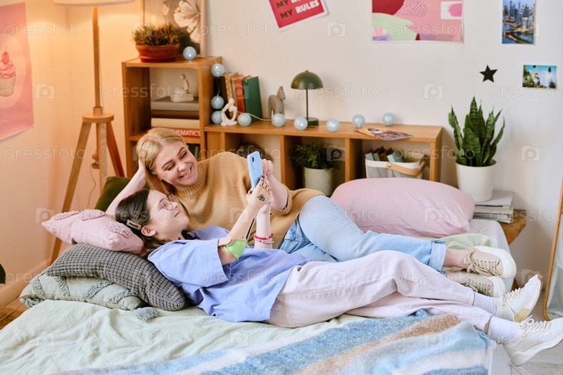 Родитель и ребенок расслабляются на уютной кровати и делают селфи вместе