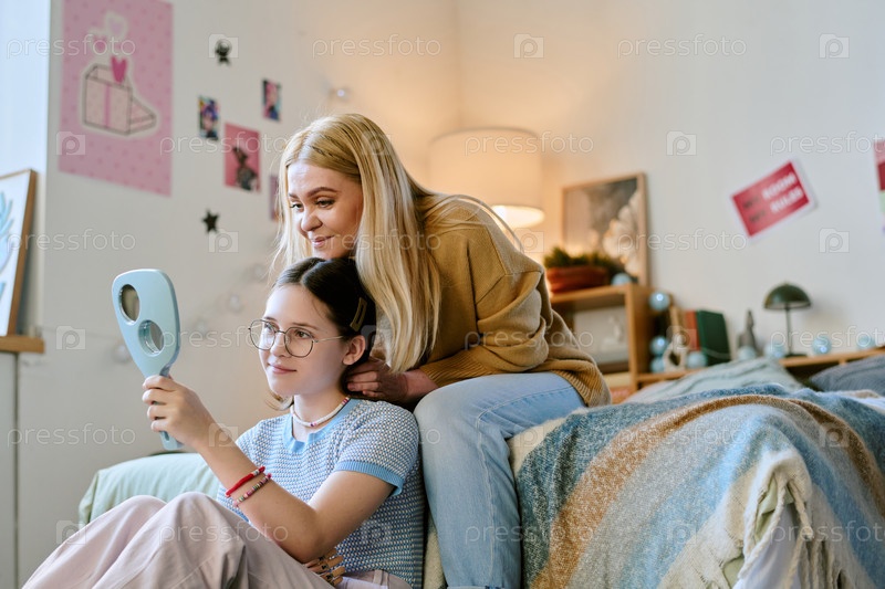 Подросток и женщина улыбаются и смотрят в зеркало в комнате
