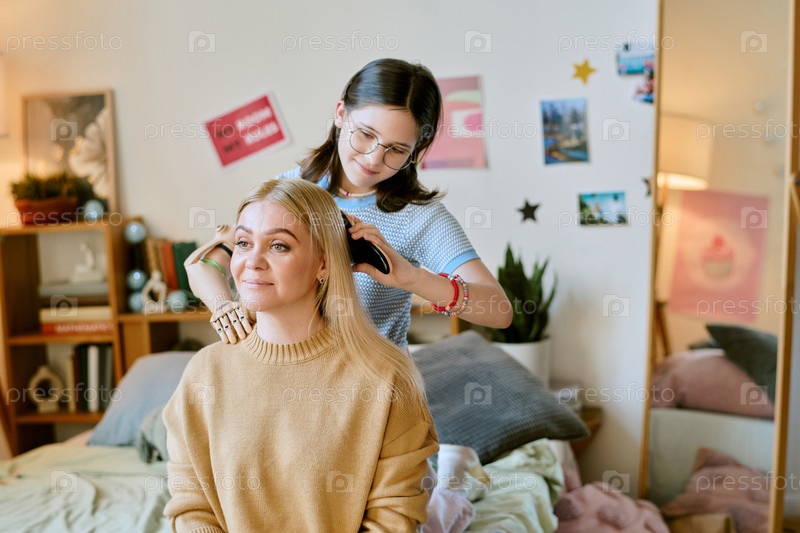 Подростковая девушка стилизует волосы улыбающейся блондинки