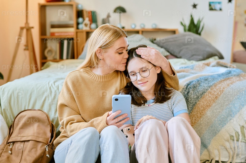 Мать показывает дочке экран мобильного телефона, улыбаясь вместе
