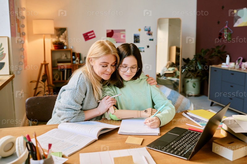 Обнимая мать и дочь-подростка, которые учатся вместе