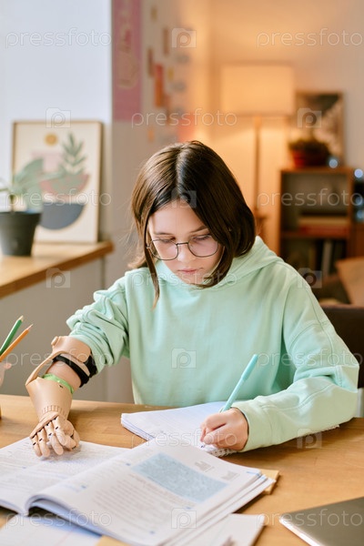 Молодая девушка учится за столом с протезированной рукой