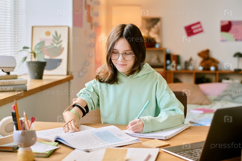 Женщина учится за столом с открытыми книгами и бумагами