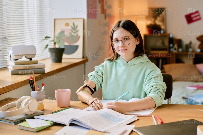 Портрет молодой женщины, изучающей за столом в уютной комнате