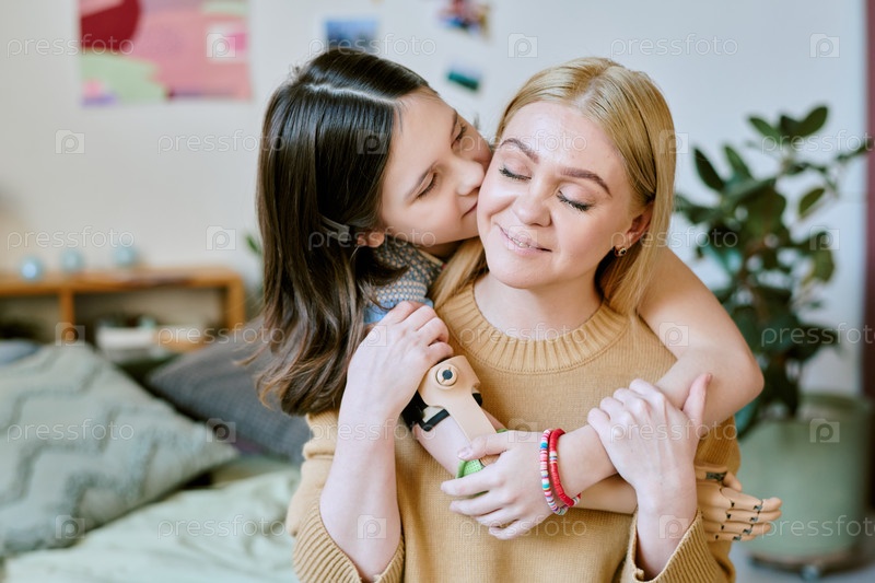 Улыбающаяся дочь обнимается и целует улыбающуюся мать в помещении