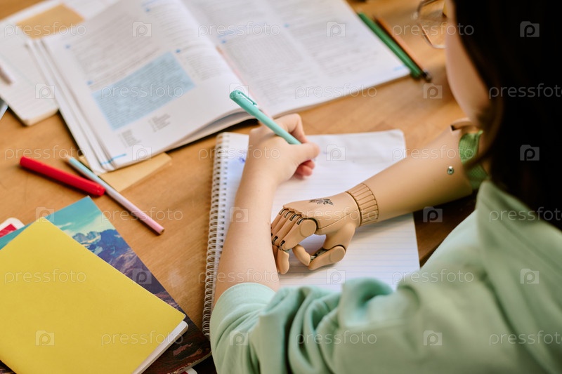 Изучение с протезированной рукой на деревянном столе