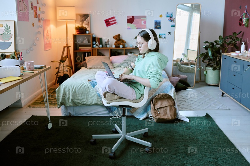 Учащаяся девочка-подросток слушает музыку в уютной спальне