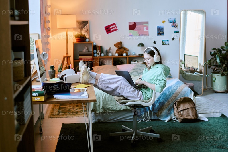 Изучение в уютной рабочей комнате спальни с наушниками