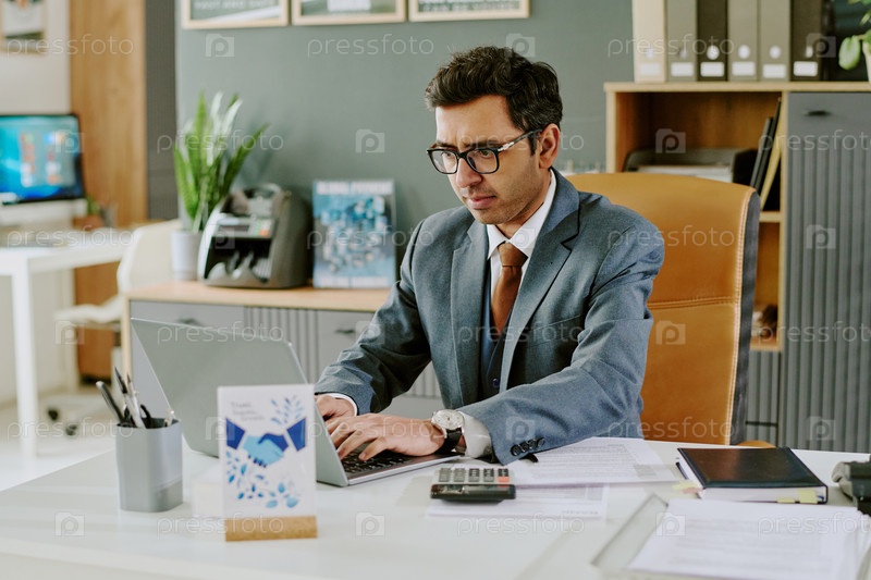 Концентрирующийся бизнесмен в современной офисной обстановке