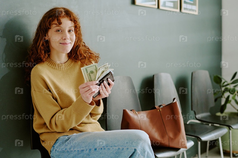 Улыбающаяся женщина держит наличные деньги, сидя рядом со стульями