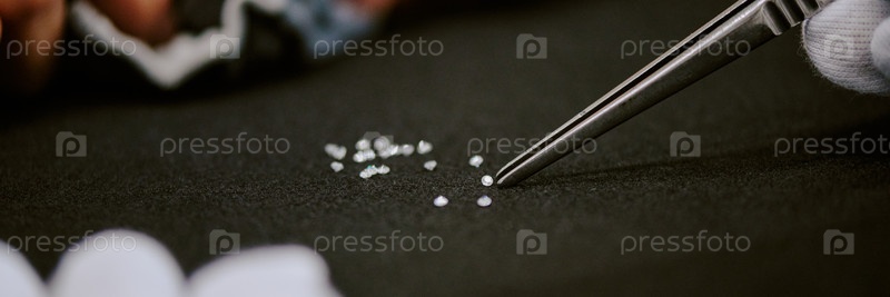 Проверка бриллиантов с помощью пинцета на черной поверхности