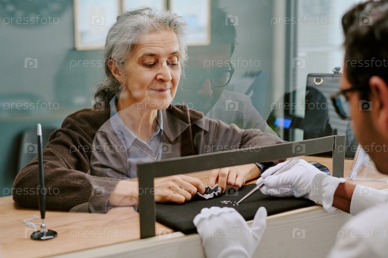 Пожилая женщина, осматривающая ювелирные изделия на прилавке с ювелиром