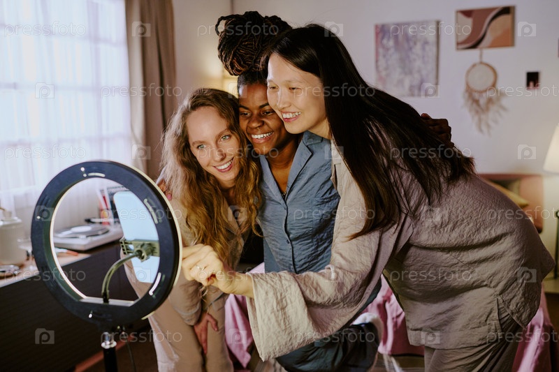 Обнимая друзей, делающих селфи