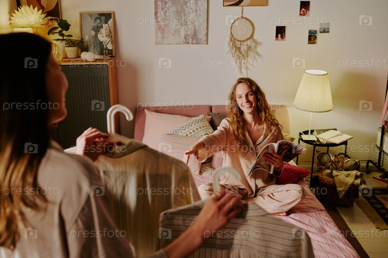 Непризнанная женщина держит два вешалка с пижамой