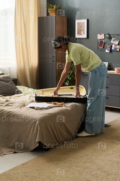 Девушка-подросток упаковывает чемодан в уютной обстановке спальни