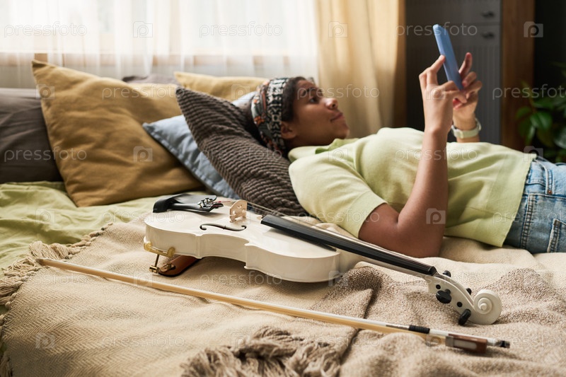 Расслабляясь в постели, просматривая смартфон с скрипкой поблизости