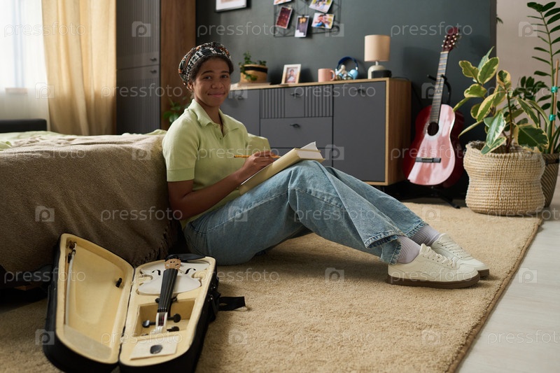 Письменные заметки, сидя на полу в спальне
