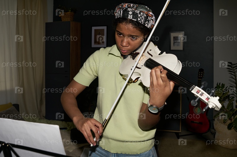 Сосредоточившись на игре на скрипке в уютной комнате ночью