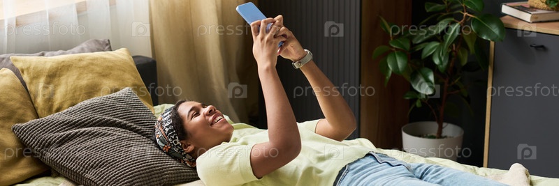 Смех Ребенок лежит на кровати и смотрит в смартфон