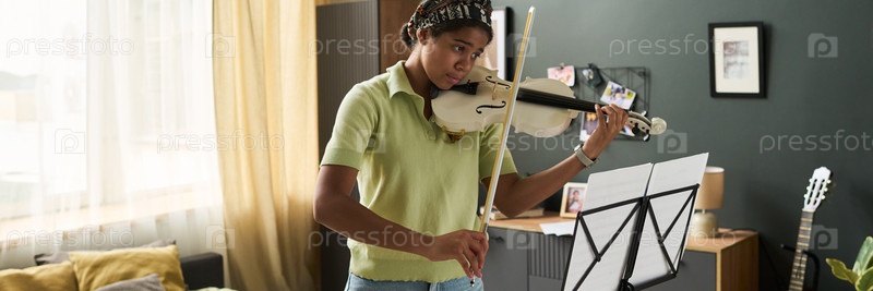Девушка-подросток играет на скрипке в уютной квартире