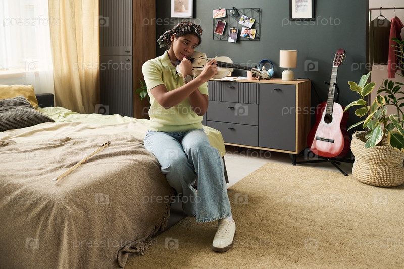 Подростковая девушка играет на флейте в уютной обстановке спальни
